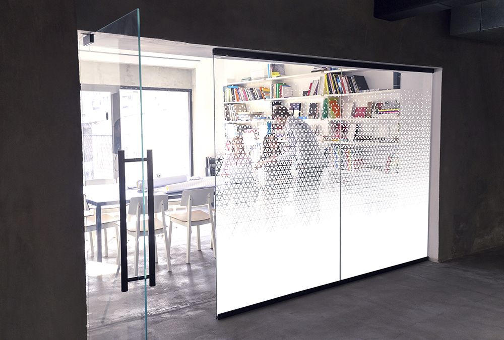 SXJ-0594 Triangle Gradient. A stunning white and frost triangle patterned gradient, providing semi-privacy as the triangles disperse from the bottom upwards. Priced per running ft. Order the length (quantity) needed in number of feet x 71″ high.